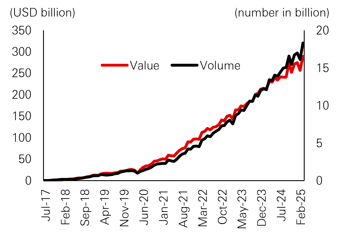 Source: NPCI, data as of March 2025. The value of UPI transactions was converted using the spot rate of 85.58 on April 3.