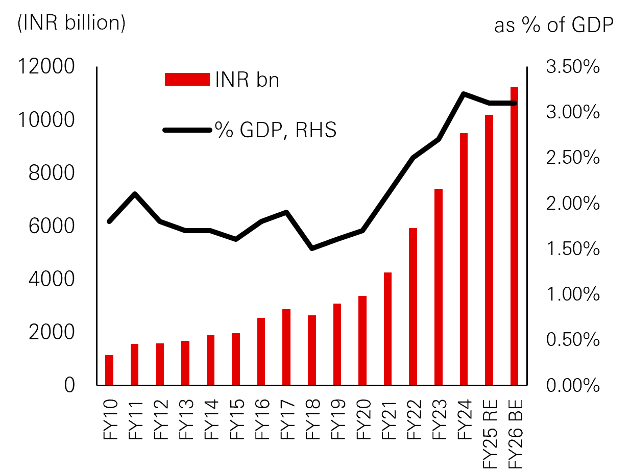 Infrastructure: India is undergoing a transformative phase with significant government investments in infrastructure. Massive projects in transportation, energy, and urban development are at the forefront of this modernization drive. The development of highways, railways, and ports is set to improve connectivity and reduce logistical costs, thereby enhancing overall economic efficiency. In the last Union Budget, the government’s capital expenditure has been sustained at 3.1 per cent of GDP (Fig. 9) in the FY26 budget while fiscal deficit has been reined in at 4.4 per cent of GDP.7